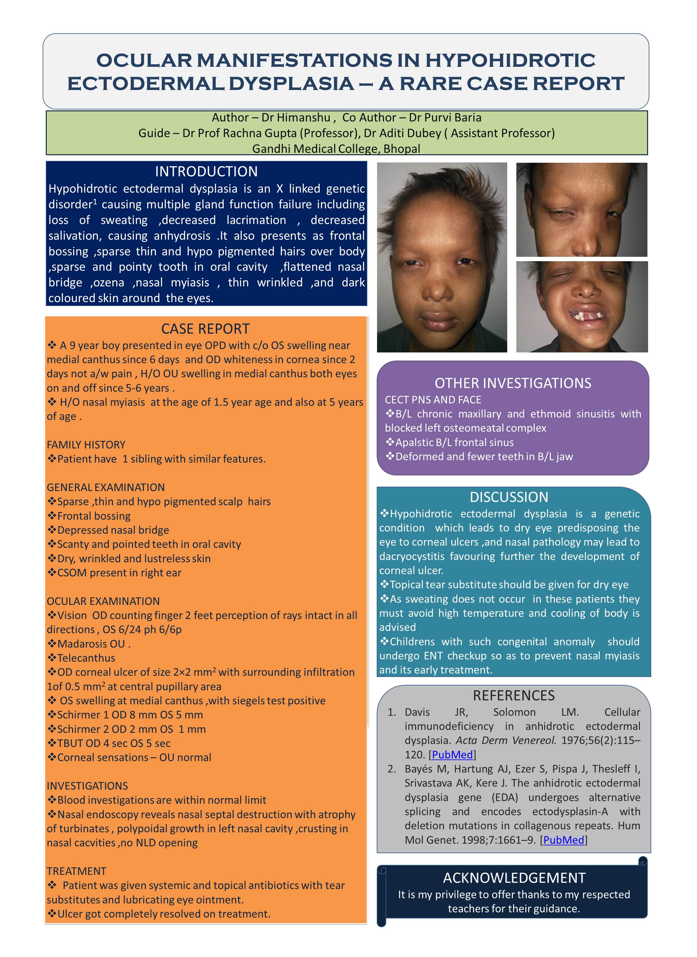 Conclusion :- Hypohiderotic ectodermal dysplasia is a rare congenital anomaly. It manifests with dry eye ,madarosis. In our case presented with dry eye, madarosis and OD corneal ulcer with OS chronic dacryocystitis