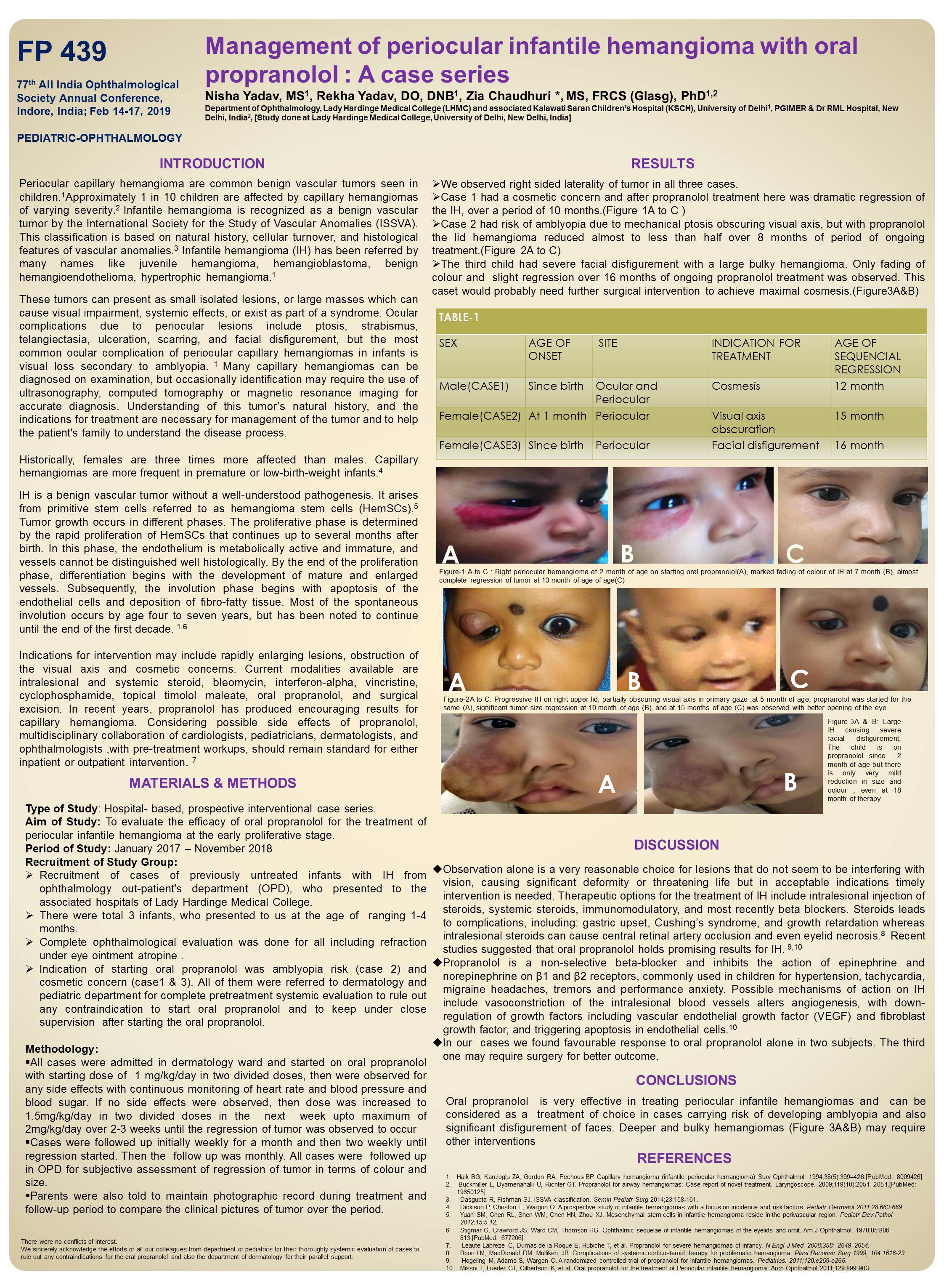 Infantile hemangioma (IH), is the most common benign tumor in children, observed in 4-5% of infants and is characterized by early proliferation and subsequent spontaneous involution. Periocular IH may result in amblyopia,squintand severe disfigurement,all of which may needcustomized management.We observed 3 infants with periocular IH for whom thorough ophthalmic and systemic evaluation was performed. Oral propanolol was started at low dose (0.5 mg/kg/day) at first week followed by gradual increase to maximum dosage over 6 weeks(3mg/kg/day).Clinically, we observed remarkableregression emphasized bycolour attenuation and reduction in size of the tunour over a period of one year.We emphasize this modality to be an effective management for infants with this potentially disfiguring and functionally debilitating condition that is often cause for major concern in parents.